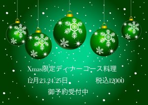 12月23,24,25日 クリスマス限定ディナーコース料理予約受付開始いたしました。 お一人様税込み12000円となります。席に限りがありますのでご予約はお早めによろしくお願いいたします。 写真は2024年 のクリスマスのものです。シェアする